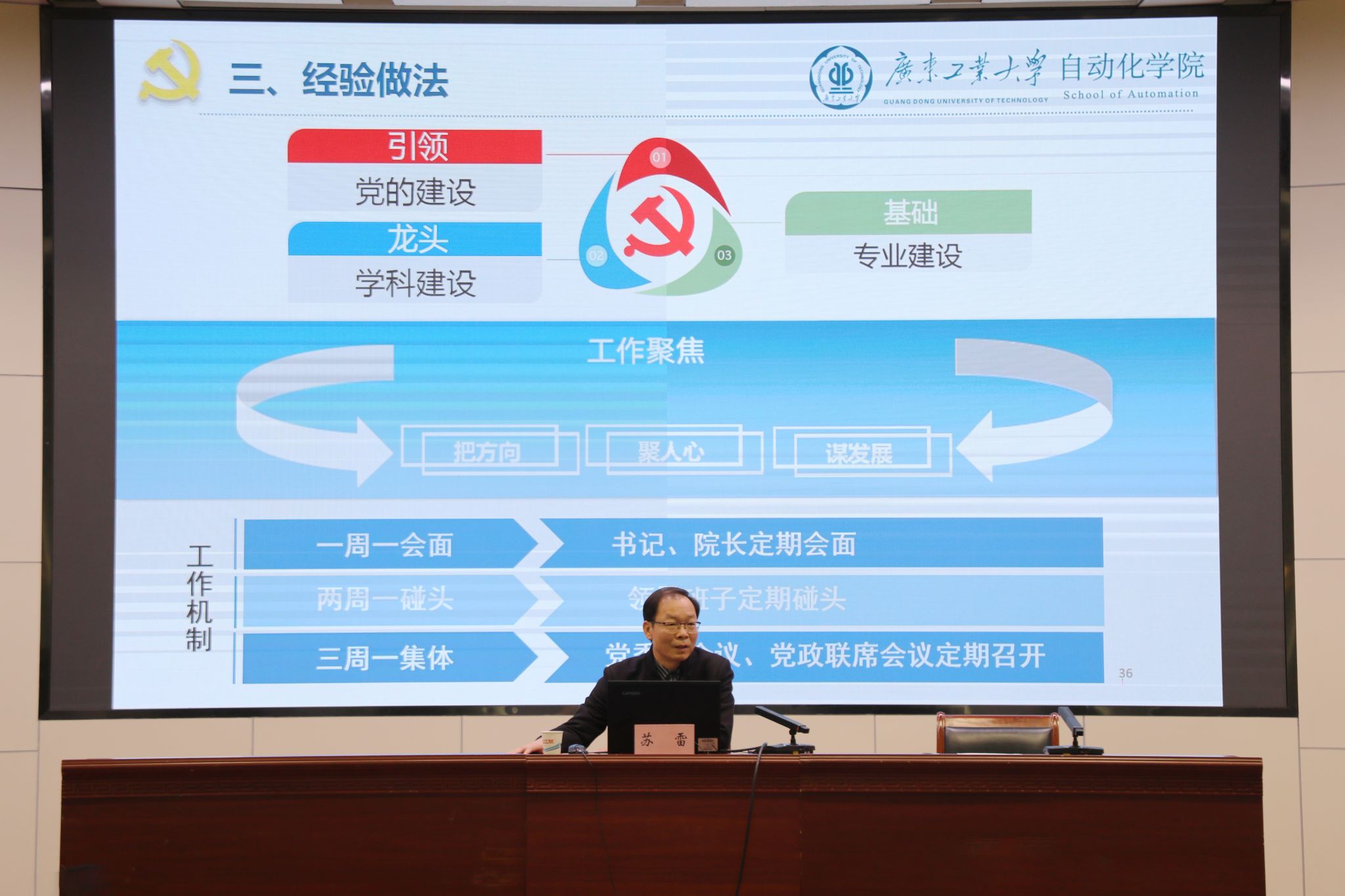 苏雷结合自身党建工作的实践经验,以《坚持以高质量党建引领高质量发展的高校院系基层实践与思考》为题,从基本情况、实践成果、经验做法和若干思考四个方面,系统分享了广东工业大学自动化学院以高质量党建引领事业高质量发展的探索历程与创新经验,并就如何推动党建与教学科研、学科建设、人才培养、师德师风等方面工作深度融合进行了系统阐述和深入解读。