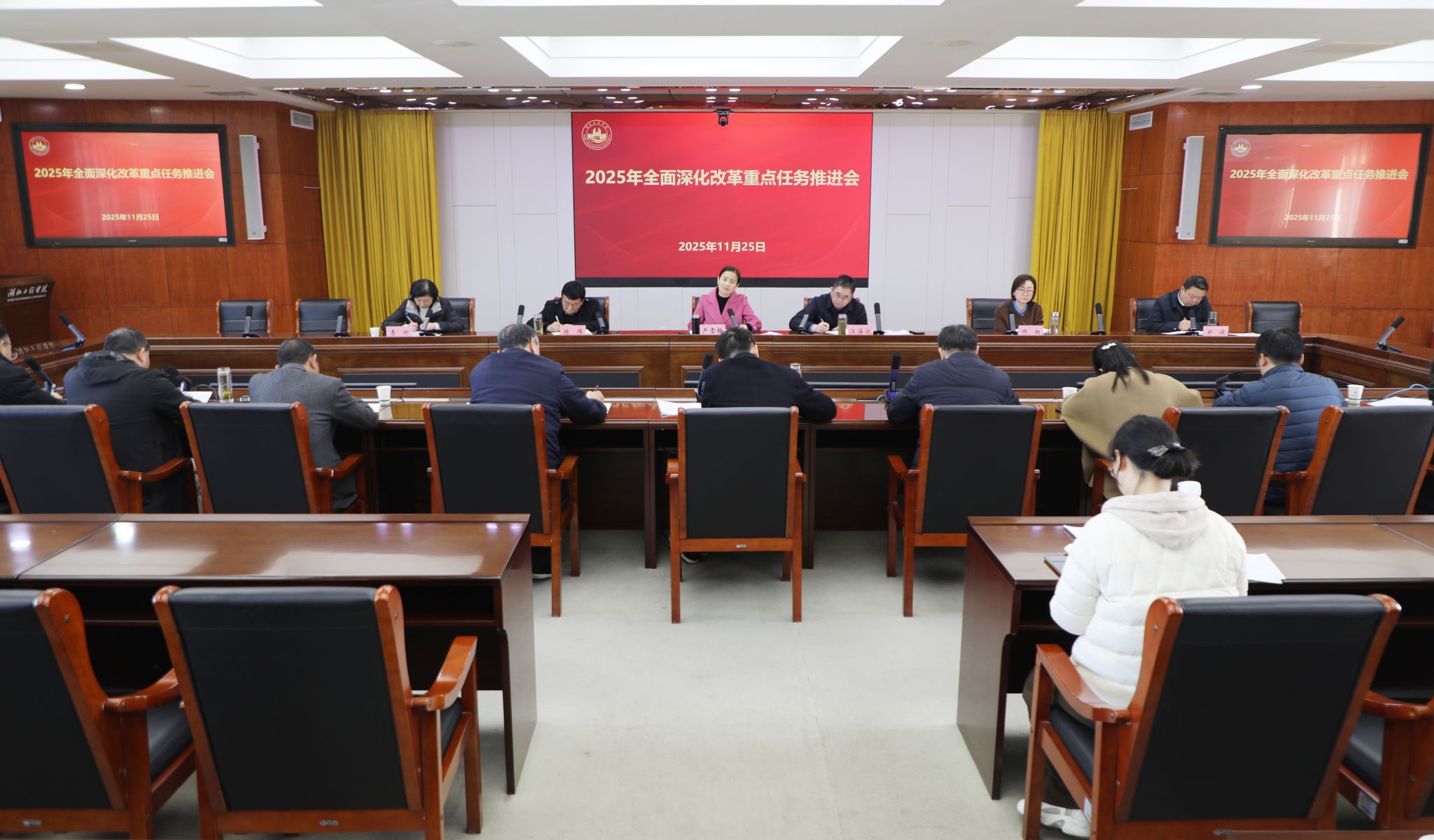 11月25日,学校召开全面深化改革重点任务推进会,研究深化改革专项工作推进和任务落实工作。全体在校校领导、深化改革重点任务牵头及参与单位负责人参加会议。学校党委书记卢雪梅出席会议并讲话,校长汪海波主持会议。