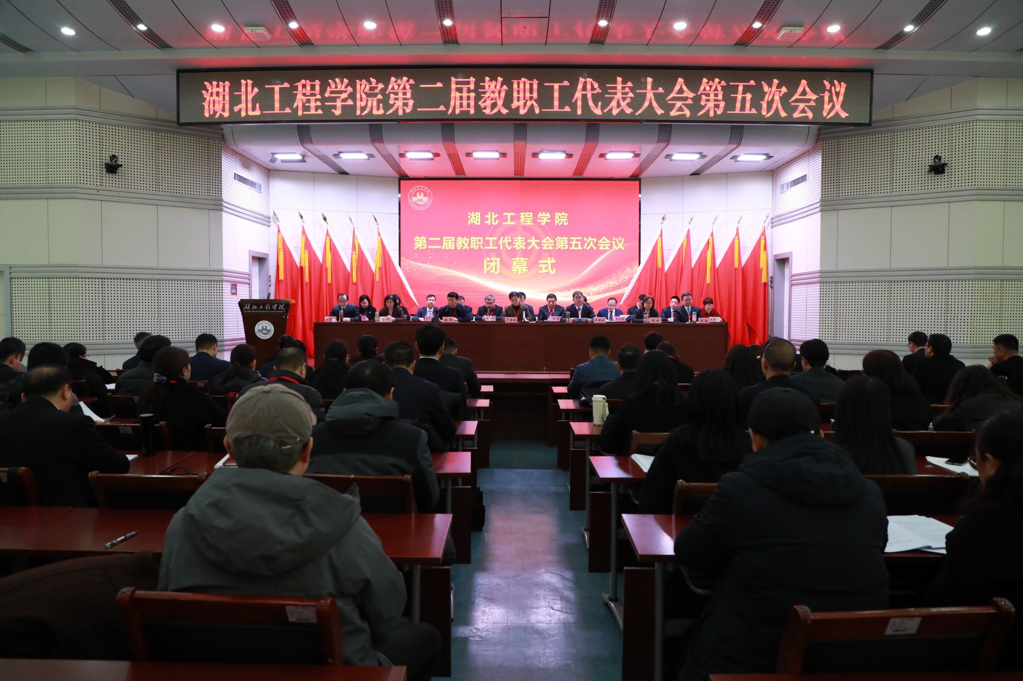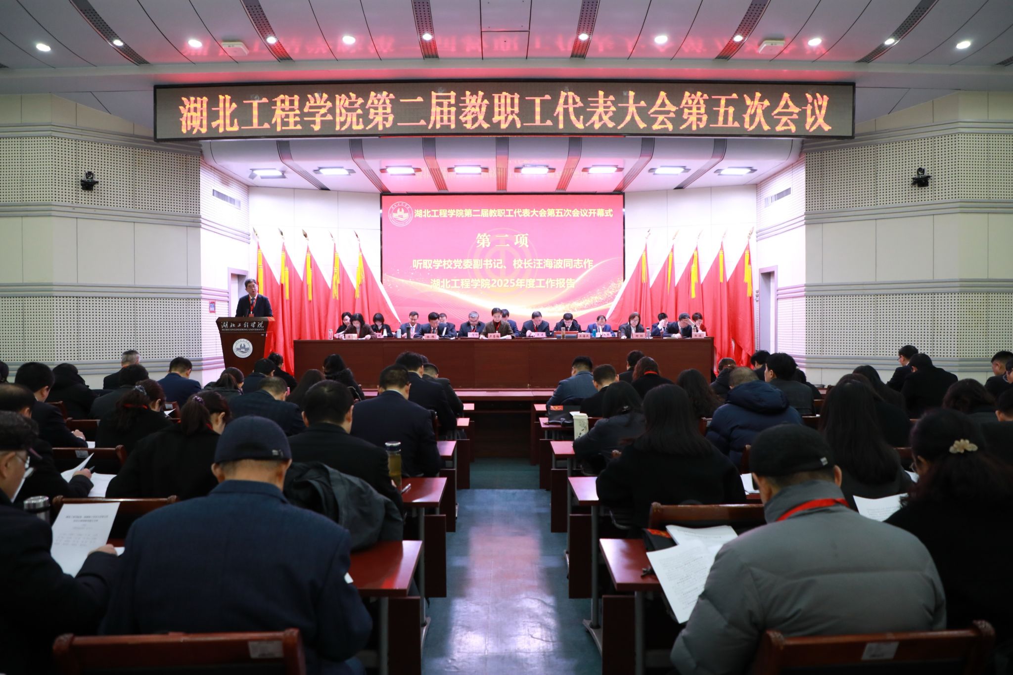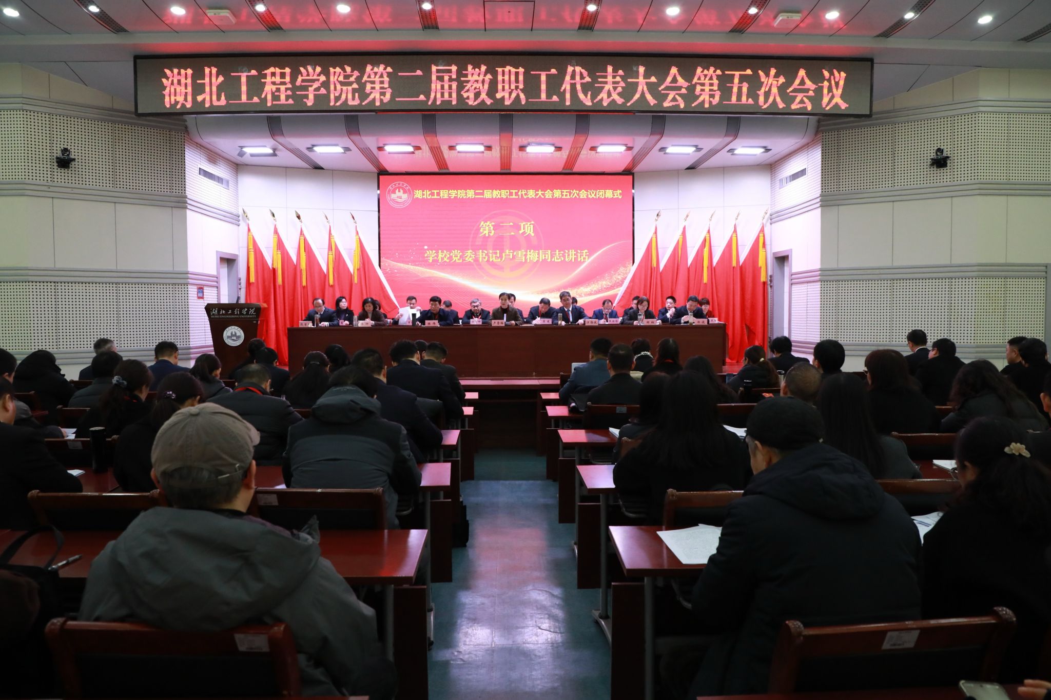 1月9日,湖北工程学院第二届教职工代表大会第五次会议在文学楼报告厅胜利召开。校领导卢雪梅、汪海波、陈伟、邹虹、李渺、郑俊、熊曾刚出席会议。大会主席团成员在主席台就座。上午的开幕会由学校党委副书记、工会主席陈伟主持,党委副书记、校长汪海波主持了下午的闭幕会。